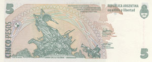 EspecificacionesDivisaPeso ConvertibleSerie2002Valor5 LinkAño2002 LinkEmisorBanco Central de la República ArgentinaInformación adicionalTamaño155 x 65 mmAnversoGral. José de San Martín LinkReversoEl Cerro de la Gloria Mendoza LinkLeyendaREPÚBLICA ARGENTINA en unión y libertad