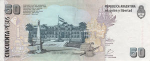 EspecificacionesDivisaPeso ConvertibleSerie2002Valor50 LinkAño2002 LinkEmisorBanco Central de la República ArgentinaInformación adicionalTamaño155 x 65 mmAnversoDomingo Faustino Sarmiento LinkReversoCasa de Gobierno LinkLeyendaREPÚBLICA ARGENTINA en unión y libertad