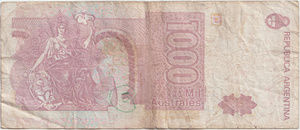EspecificacionesDivisaAustralSerieAustralValor1000 LinkAño1985 LinkEmisorBanco Central de la República ArgentinaInformación adicionalTamaño155 x 65 mmAnversoJulio A. Roca LinkReversoEfigie del Progreso Link