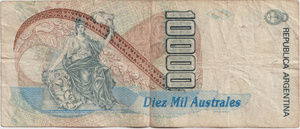 EspecificacionesDivisaAustralSerieAustralValor10000 LinkAño1985 LinkEmisorBanco Central de la República ArgentinaInformación adicionalTamaño155 x 65 mmAnversoCarlos Pellegrini LinkReversoEfigie del Progreso Link