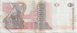 EspecificacionesDivisaAustralSerieAustralValor5000 LinkAño1985 LinkEmisorBanco Central de la República ArgentinaInformación adicionalTamaño155 x 65 mmAnversoMiguel Juarez Celman LinkReversoEfigie del Progreso Link