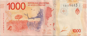 EspecificacionesDivisaPeso ConvertibleSerieFauna AutoctonaValor1000 LinkAño2020 LinkEmisorBanco Central de la República ArgentinaInformación adicionalColoresTamaño155 x 65 mmAnversoHornero (ave nacional) LinkReversoRegión Centro LinkLeyendaREPÚBLICA ARGENTINA en unión y libertad