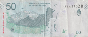 EspecificacionesDivisaPeso ConvertibleSerieFauna AutoctonaValor50 LinkAño2020 LinkEmisorBanco Central de la República ArgentinaInformación adicionalColoresTamaño155 x 65 mmAnversoCóndor LinkReversoRegión Andina LinkLeyendaREPÚBLICA ARGENTINA en unión y libertad
