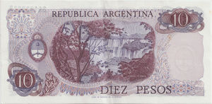 EspecificacionesDivisaPeso Ley 18188SeriePeso Ley 18188Valor10 LinkAño1981 LinkEmisorBanco Central de la República ArgentinaInformación adicionalTamaño155 x 75 mmAnversoGral. Manuel Belgrano LinkReversoCataratas del Iguazu Link