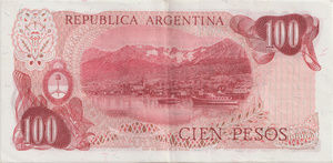EspecificacionesDivisaPeso Ley 18188SeriePeso Ley 18188Valor100 LinkAño1981 LinkEmisorBanco Central de la República ArgentinaInformación adicionalTamaño155 x 75 mmAnversoGral. José de San Martín LinkReversoUshuaia Link