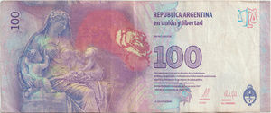 EspecificacionesDivisaPeso ConvertibleSerieTenemos PatriaValor100 LinkAño2012 LinkEmisorBanco Central de la República ArgentinaInformación adicionalTamaño155 x 65 mmAnversoMaría Eva Duarte de Perón LinkReversoDetalle del friso del altar romano de la Paz de Augusto LinkLeyendaREPÚBLICA ARGENTINA en unión y libertad